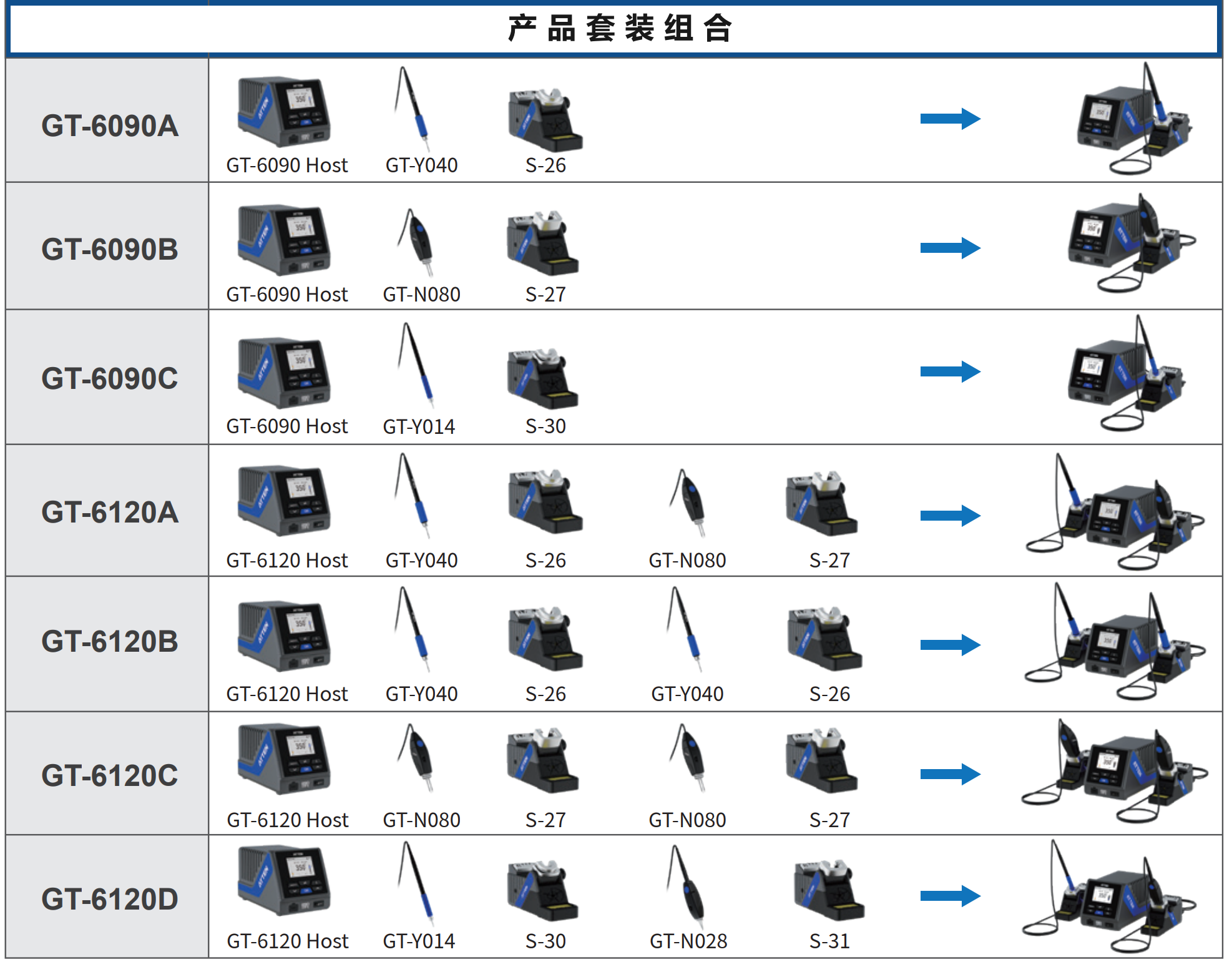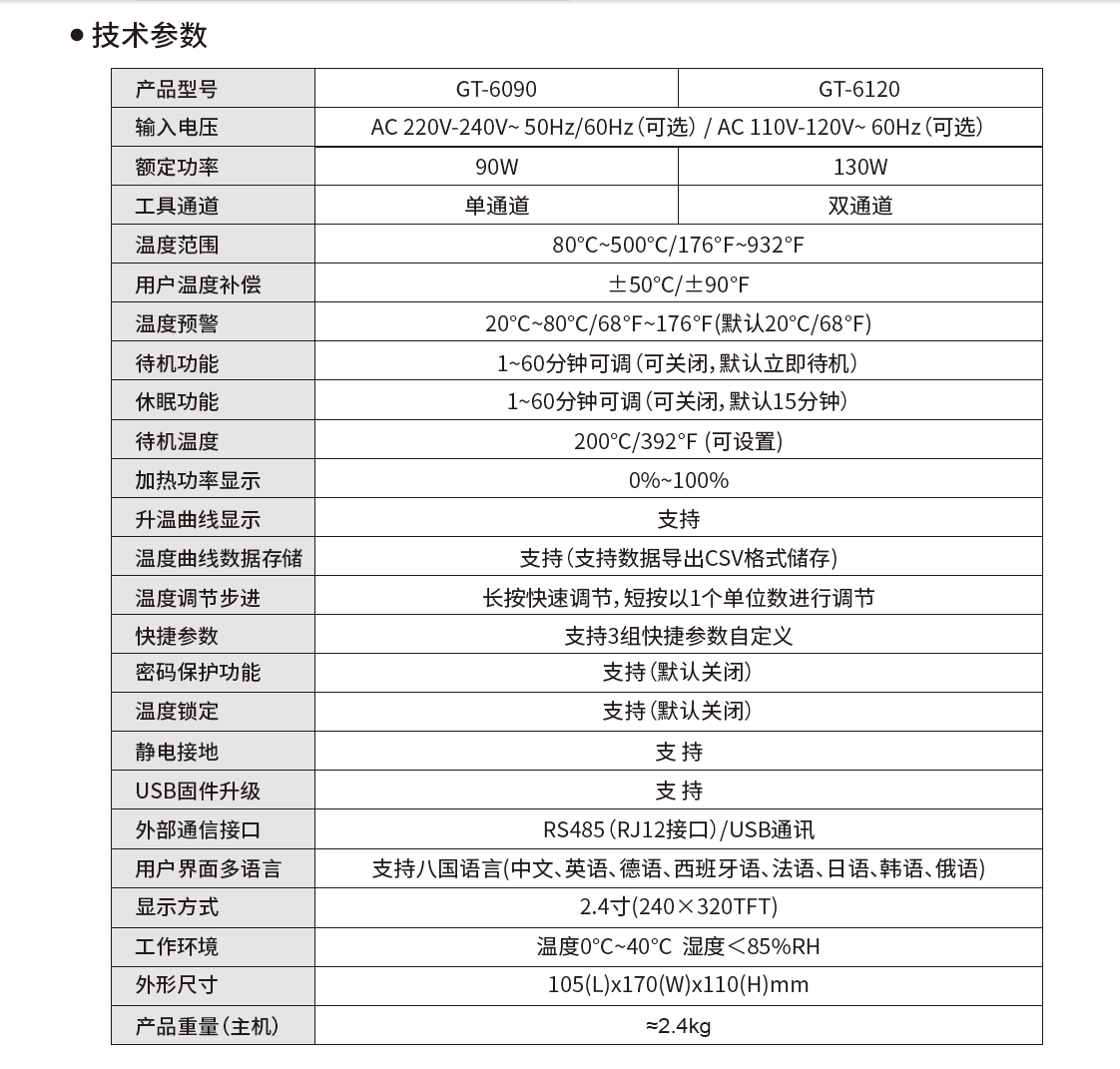 GT-6120主机1台,GT烙铁手柄2支,烙铁座2个,烙铁座连接线1条,接地线1条,USB2.0数据线1条,电源线1条,说明书:1 本, 合格证1张。